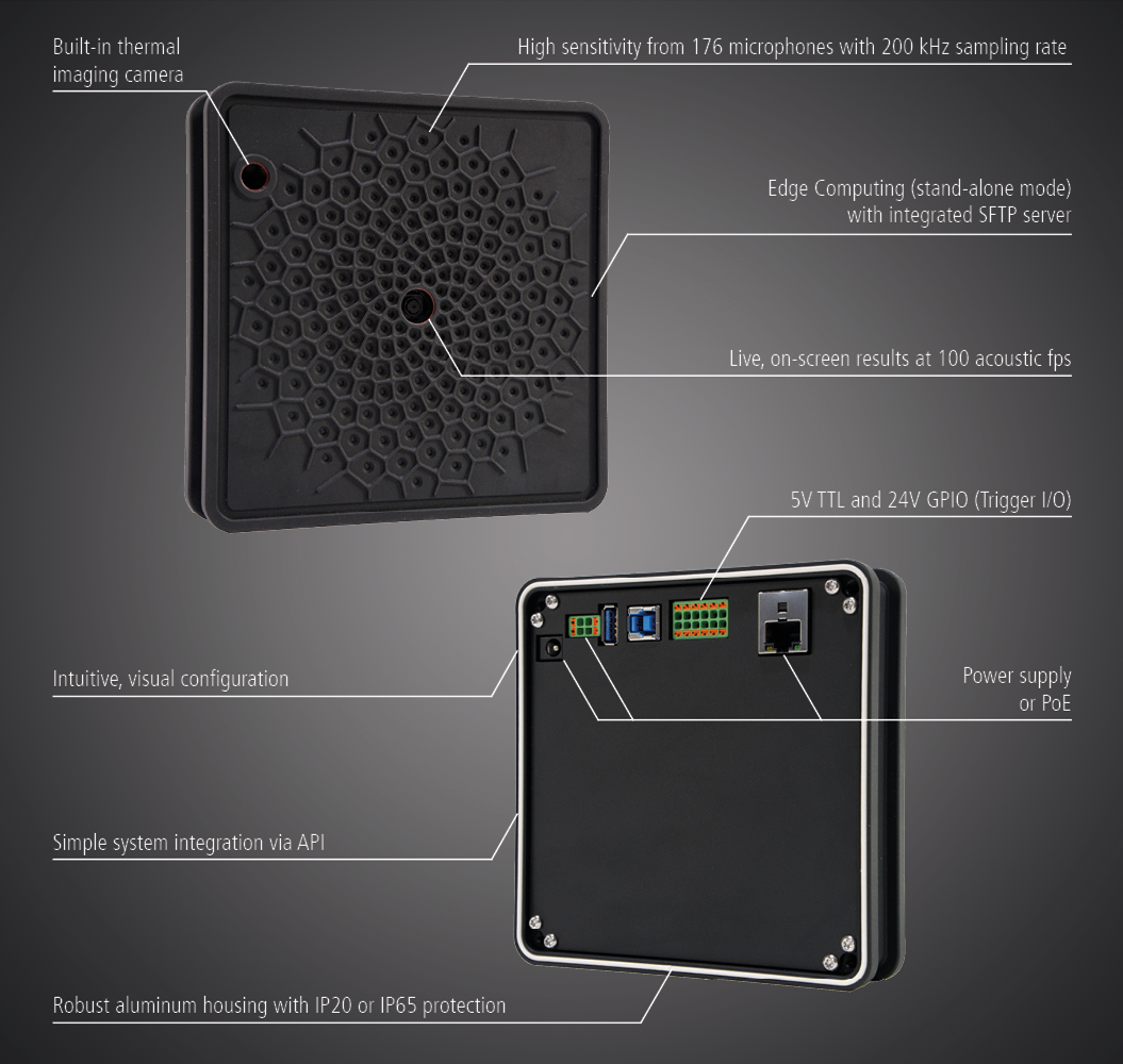 The SoundCam Ultra 3 Sensor is a compact, high-performance acoustic camera with real-time analysis in both the audible and ultrasonic frequency ranges. The large number of microphones generates high-resolution acoustic images with a wide dynamic range – allowing even weak sources to become visible alongside louder ones. An optical camera and a thermal imaging camera provide additional data for evaluations.